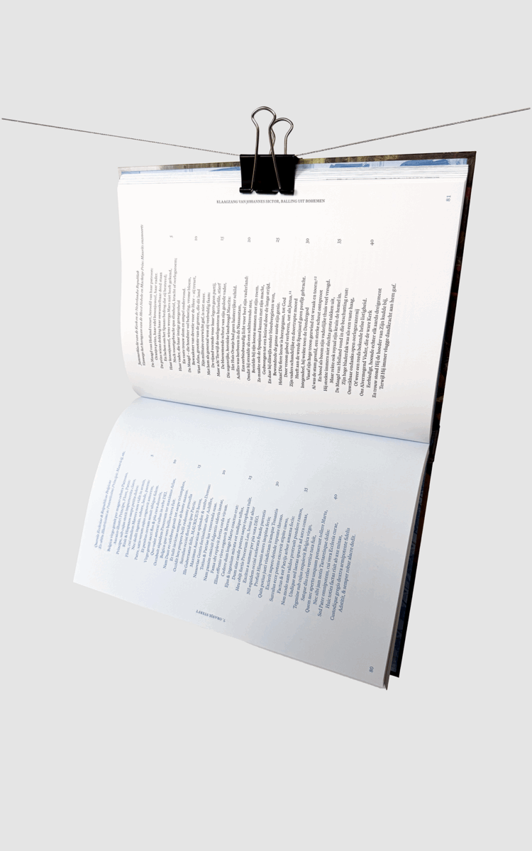 De originele bronteksten staan in de kleur blauw. Door met kolombreedte te spelen, blijven de talen evenwichtig. Het resultaat is een boek dat uitnodigt om de volgende pagina om te slaan.